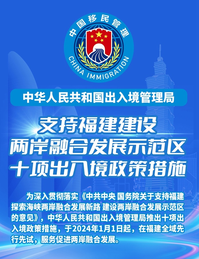 新華社北京11月6日電(記者任沁沁)記者6日從中華人民共和國(guó)出入境管理局獲悉,為深入貫徹落實(shí)《中共中央 國(guó)務(wù)院關(guān)于支持福建探索海峽兩岸融合發(fā)展新路 建設(shè)兩岸融合發(fā)展示范區(qū)的意見(jiàn)》,該局緊扣兩岸融合發(fā)展示范區(qū)建設(shè)規(guī)劃,聚焦臺(tái)胞臺(tái)商臺(tái)企所需所盼,研究出臺(tái)十項(xiàng)出入境政策措施(以下簡(jiǎn)稱“十項(xiàng)措施”),并將于2024年1月1日起實(shí)施,進(jìn)一步促進(jìn)閩臺(tái)人員往來(lái)、便利臺(tái)胞在閩居住生活,深化兩岸各領(lǐng)域融合發(fā)展。