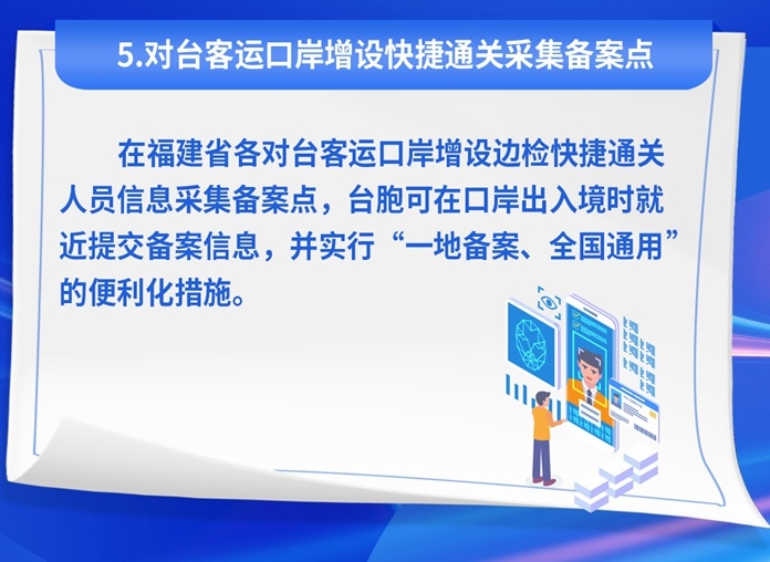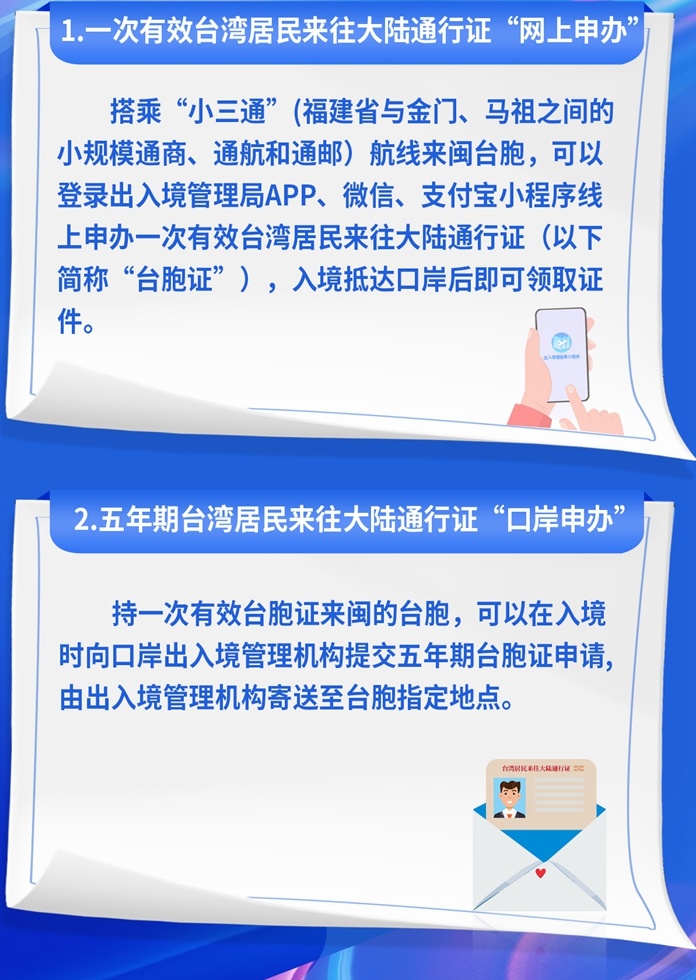 在便利臺(tái)胞往來(lái)方面,實(shí)行臺(tái)灣居民來(lái)往大陸通行證(以下簡(jiǎn)稱“臺(tái)胞證”)“網(wǎng)上辦”“口岸辦”“集中辦”,辦證方式更加便捷,辦證渠道更加豐富,臺(tái)胞來(lái)閩實(shí)現(xiàn)“想來(lái)即來(lái)”;推動(dòng)在廈門(mén)設(shè)立出入境證件制作中心,廈金、福馬“同城生活圈”人員辦理出入境證件時(shí)限由7個(gè)工作日縮短至5個(gè)工作日。