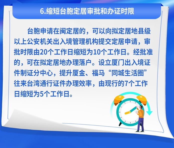 在鼓勵(lì)臺(tái)胞來(lái)閩定居落戶方面,明確申請(qǐng)?jiān)陂}定居的臺(tái)胞,可以向擬定居地縣級(jí)以上公安機(jī)關(guān)出入境管理機(jī)構(gòu)提交定居申請(qǐng),審批時(shí)限由20個(gè)工作日縮短至10個(gè)工作日。經(jīng)批準(zhǔn)的,可在擬定居地辦理落戶。