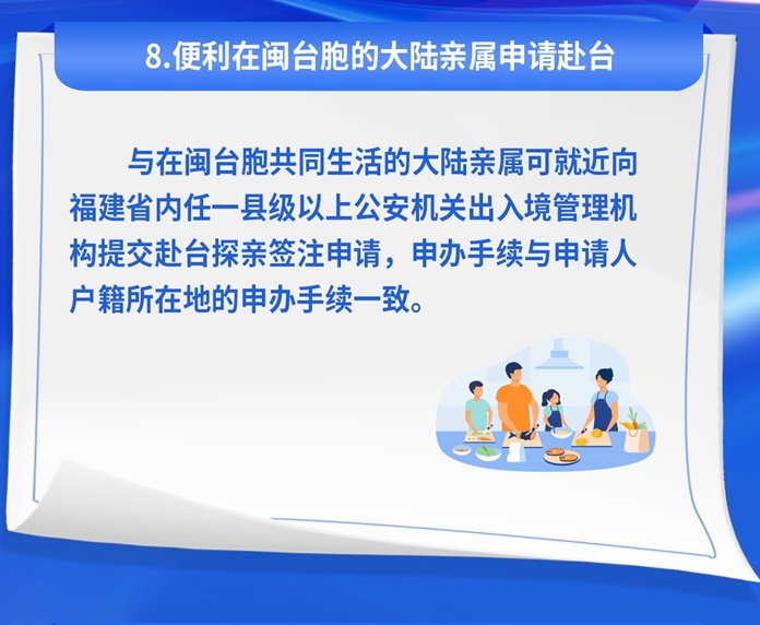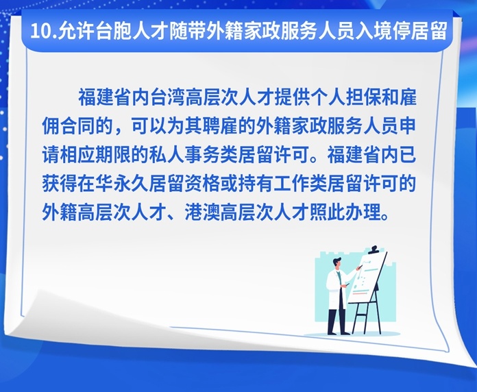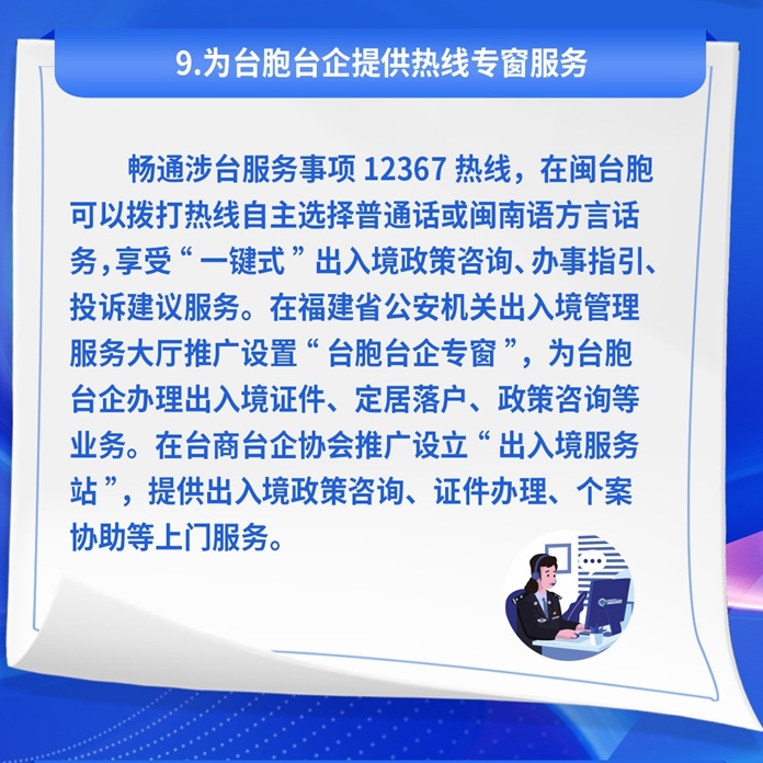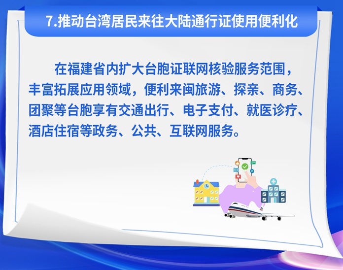 在便利臺(tái)胞在閩生活發(fā)展方面,擴(kuò)大臺(tái)胞證聯(lián)網(wǎng)核驗(yàn)服務(wù)范圍,來(lái)閩短期旅游、探親、商務(wù)的臺(tái)胞持用臺(tái)胞證也可享有交通出行、電子支付等公共服務(wù)便利;推廣設(shè)立“臺(tái)胞臺(tái)企專窗”和“出入境服務(wù)站”,進(jìn)一步拓展12367熱線涉臺(tái)服務(wù)事項(xiàng),為在閩臺(tái)胞臺(tái)企提供高效的政策咨詢、業(yè)務(wù)辦理等政務(wù)服務(wù);允許臺(tái)胞人才隨帶外籍家政服務(wù)人員入境和停居留,方便在閩安居安業(yè)。