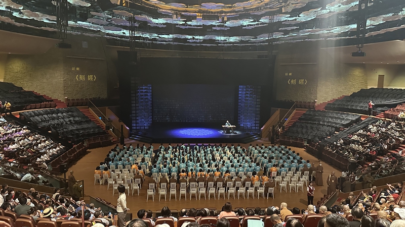 演出當天,佛光山大覺堂劇場座無虛席,隨著舞臺大幕緩緩拉開,觀眾們仿佛穿越時空,回到了百年前那個風雨飄搖卻又充滿希望的時代。舞臺上,運用現代科技手段展現出兩萬多片精心雕刻的佛經版組成壯觀的經版墻,逼真地還原了金陵刻經處的場景,厚重的歷史感撲面而來。新媒體光影舞臺置景,凸顯出超大型光導纖維質感的佛像,舞美設計巧妙地將科技與傳統文化相結合,營造出如夢如幻的氛圍,讓觀眾在千年間的文化對話中,感受著中華文化的博大精深。