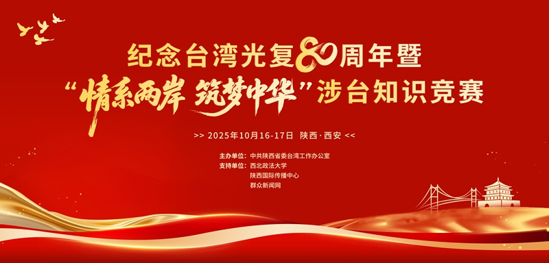 千年絲路連兩岸,三秦兒女話統一。10月17日,由陜西省委臺辦主辦,西北政法大學、陜西國際傳播中心、群眾新聞網協辦的“紀念臺灣光復80周年暨‘情系兩岸 筑夢中華’涉臺知識競賽”在西北政法大學舉辦。省委常委李明遠,省委臺辦、省政府臺辦主任姚金川,西北政法大學校黨委書記趙萬東,西北政法大學校長范九利等出席活動。